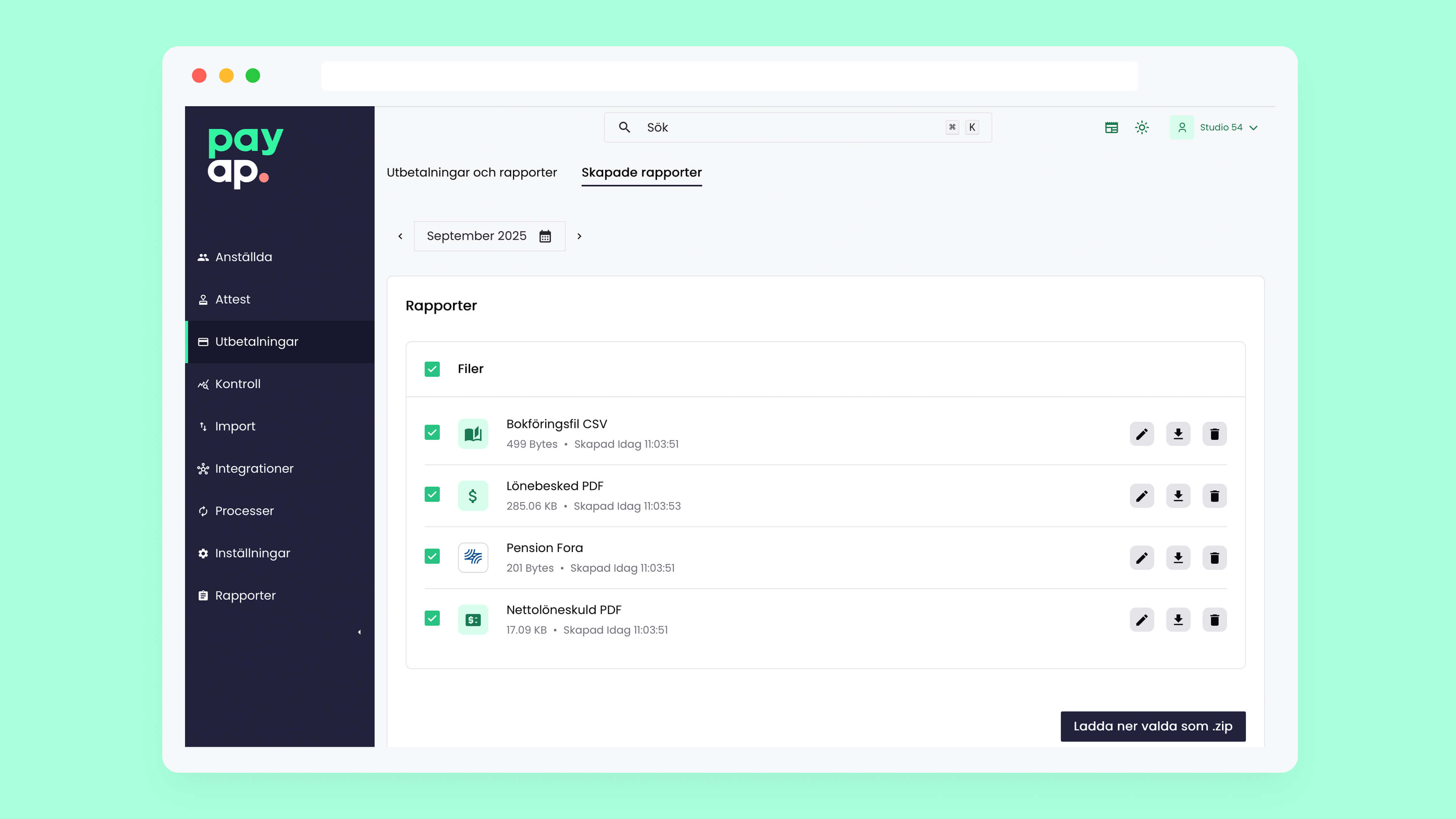 Du väljer vilka rapporter du vill ha varje månad. Sen sköter Payap resten. Så fort du gjort din löneutbetalning genereras dina rapporter automatiskt, prydligt samlade i ditt rapportpaket och redo för granskning eller nedladdning som en zip-fil.